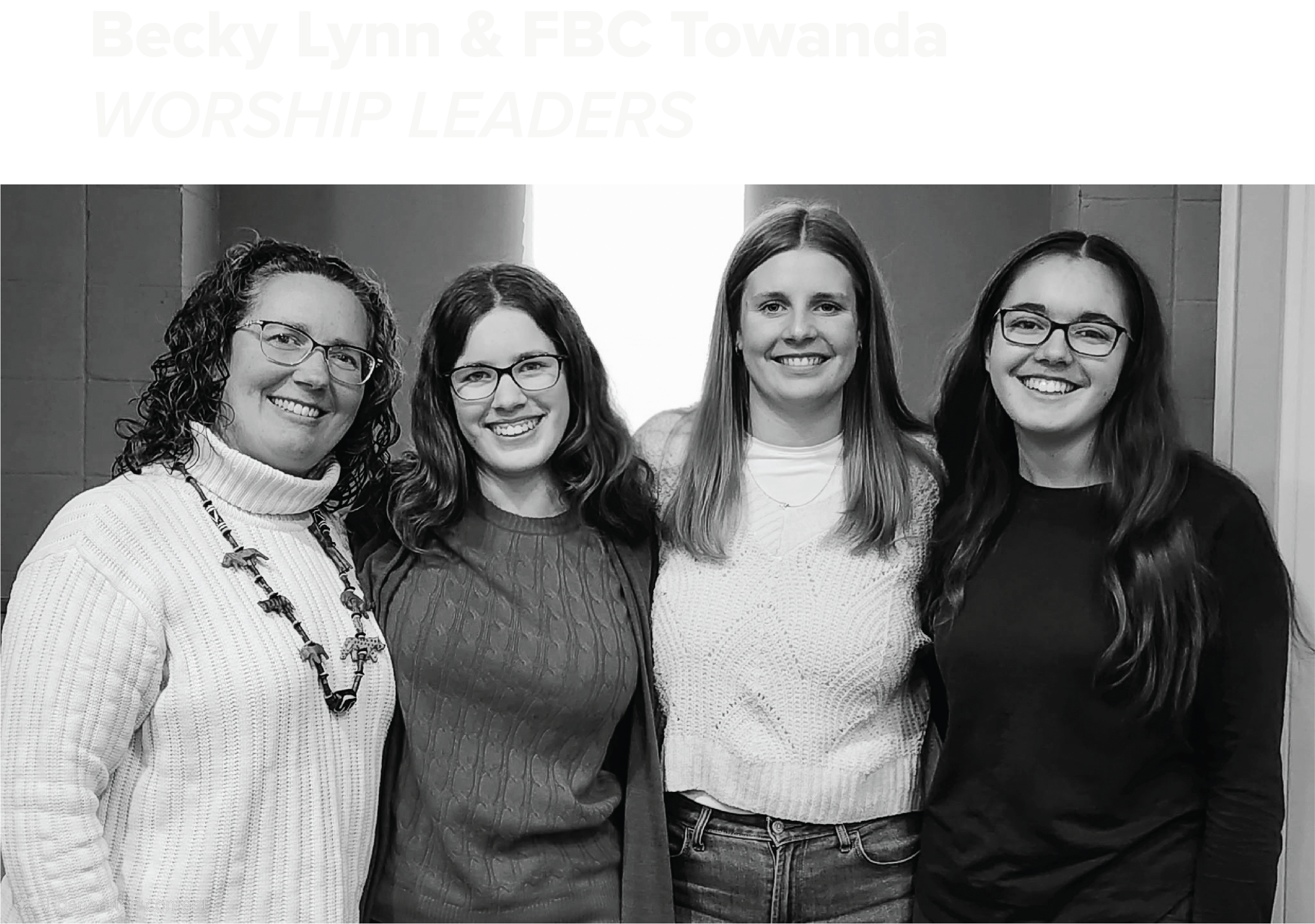 The worship team is led by Becky Lynn, a mother of four and a math professor at Friends University, who brings thoughtful leadership and a genuine heart for worship. She is joined by her daughters, Sarah Lynn, a high school senior, and Hannah Lynn, a high school sophomore, who contribute youthful energy and passion to the team. Pianist Hannah Jenkins collaborates closely in planning and leading worship and also works alongside her dad at The Insurance Shoppe in El Dorado. Together, the team serves through the worship ministry of FBC Towanda with creativity, humility, and a shared desire to lead the congregation in meaningful worship.
